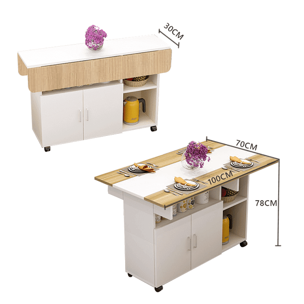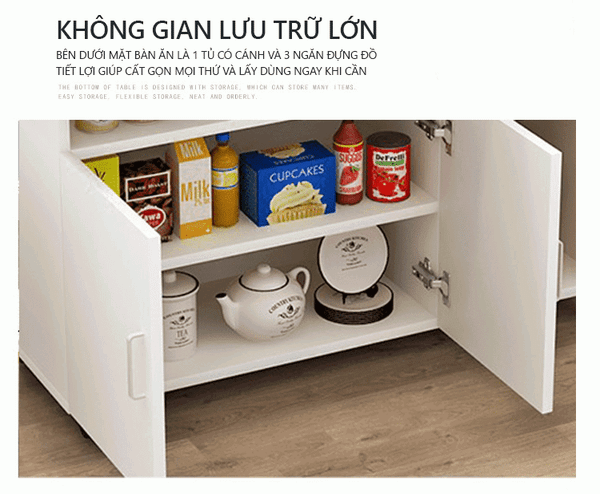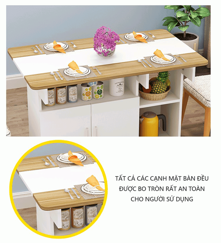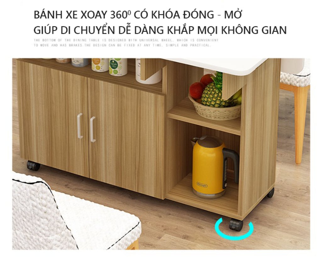 Bàn Ăn Gấp Gọn với thiết kế bề mặt được mở rộng hay gấp gọn khi không dùng đến tăng tính tiện dụng, kết hợp bánh xe 360 giúp bàn dễ dàng di chuyển hoạt cất giữ tạo sự linh hoạt cho không gian sống. Bàn có nhiều ngăn tăng thêm không gian lưu trữ vật dụng của gia đình