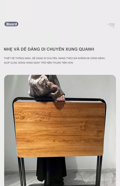 - Dễ dàng di chuyển: Nhờ trọng lượng nhẹ và thiết kế thông minh, bạn có thể mang bàn từ phòng này sang phòng khác mà không cần ai trợ giúp. Sự linh hoạt này giúp bạn tự do thay đổi bố cục nhà theo ý muốn.