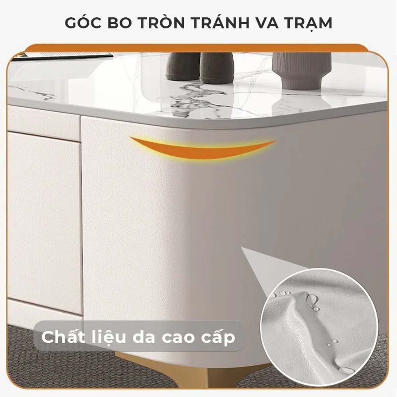 | Chất liệu | Gỗ công nghiệp MDF cao cấp mặt phủ lớp vân đá Thân bàn bọc da cao cấp |