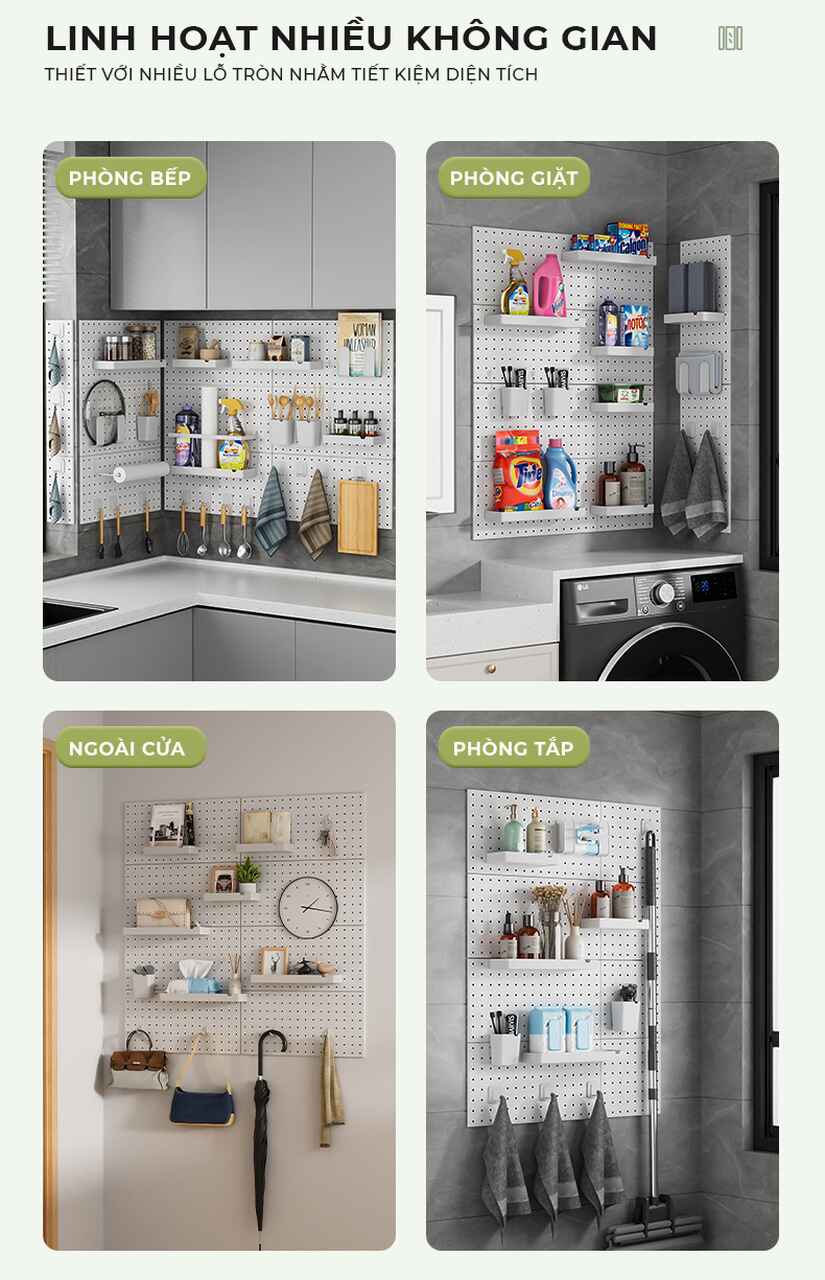 Lưu trữ thông minh: Bảng pegboard giúp bạn dễ dàng sắp xếp các vật dụng nhỏ như dụng cụ nhà bếp, mỹ phẩm, đồ trang trí, hoặc thậm chí là các dụng cụ văn phòng.
