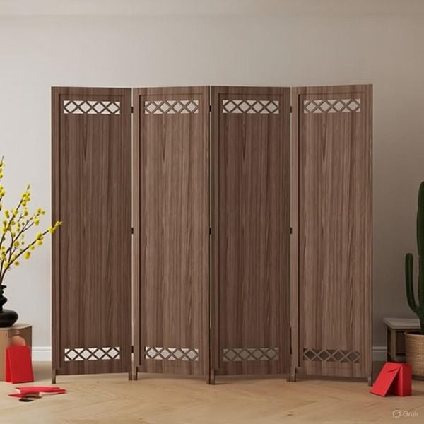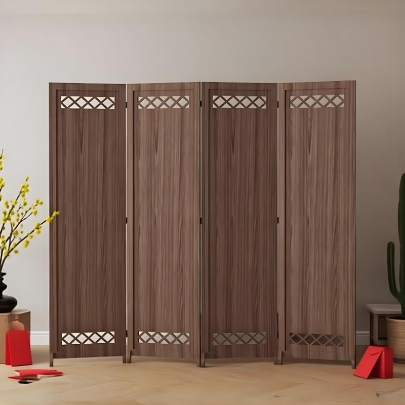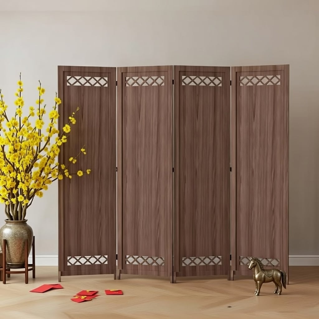 Thiết kế hiện đại và tinh tế: Tấm bình phong có các khe hở hình họa tiết quả trám ở cả phía trên và phía dưới, tạo điểm nhấn độc đáo và cho phép không gian vẫn có sự thông thoáng nhất định.