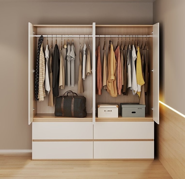 - Tủ quần áo: Tủ quần áo có thiết kế cánh mở, bên trong được chia thành nhiều ngăn, giúp bạn dễ dàng phân loại và sắp xếp quần áo, đồ dùng cá nhân. Phần ngoài của tủ được làm từ gỗ công nghiệp, có màu sắc và vân gỗ tự nhiên, tạo cảm giác ấm cúng và gần gũi.