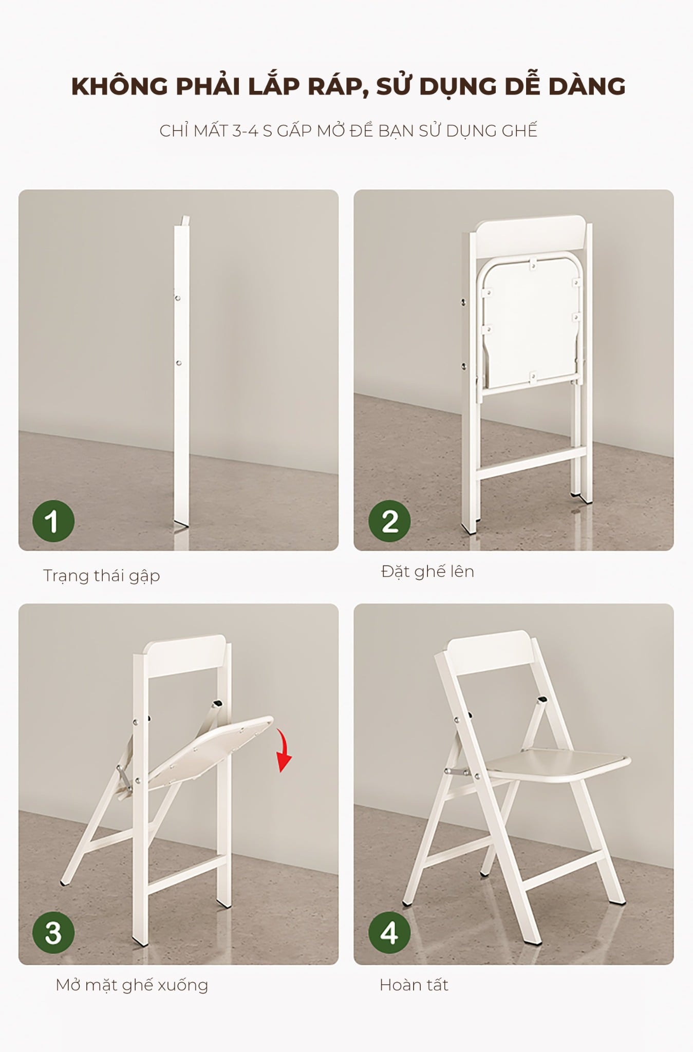 Ghế gấp gọn được làm từ chất liệu Gỗ Công Nghiệp (gỗ MDF) cao cấp phủ lớp Melamine giúp cho mặt bàn luôn luôn trơn láng sau thời gian sử dụng mà không bị trầy xước, thấm nước. Ngoài ra, ghế còn cực kỳ chắc chắn do được làm từ chất liệu gỗ cao cấp giúp chống cong vênh và chông mói mọt cực kỳ tốt.