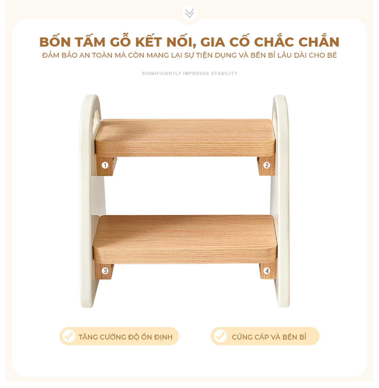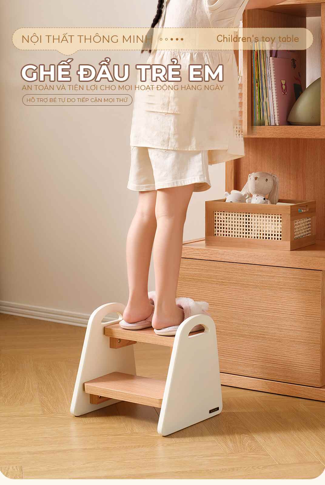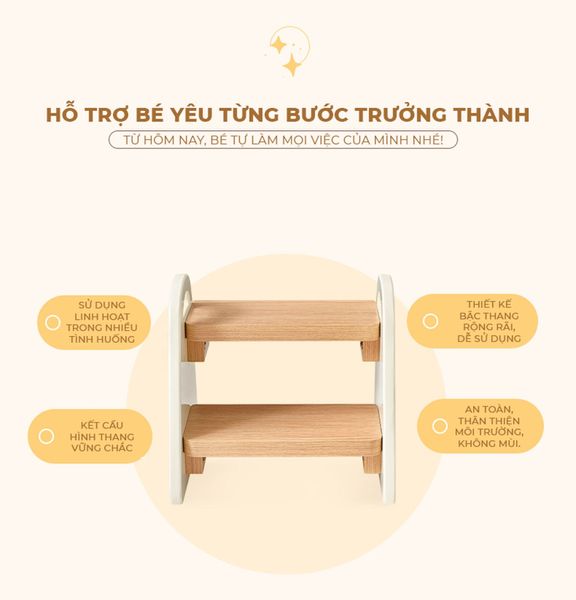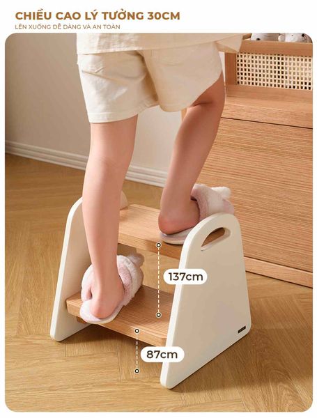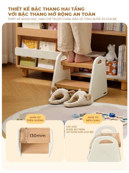 Giới thiệu ghế bậc thang 2 tầng đa năng - người bạn đồng hành lý tưởng, hỗ trợ bé yêu từng bước trưởng thành và tự lập. Với thiết kế bậc thang rộng rãi và kết cấu hình thang vững chắc, bé có thể tự tin sử dụng ghế trong nhiều tình huống khác nhau như tự rửa tay, lấy đồ vật, với tới kệ sách hay đi vệ sinh.