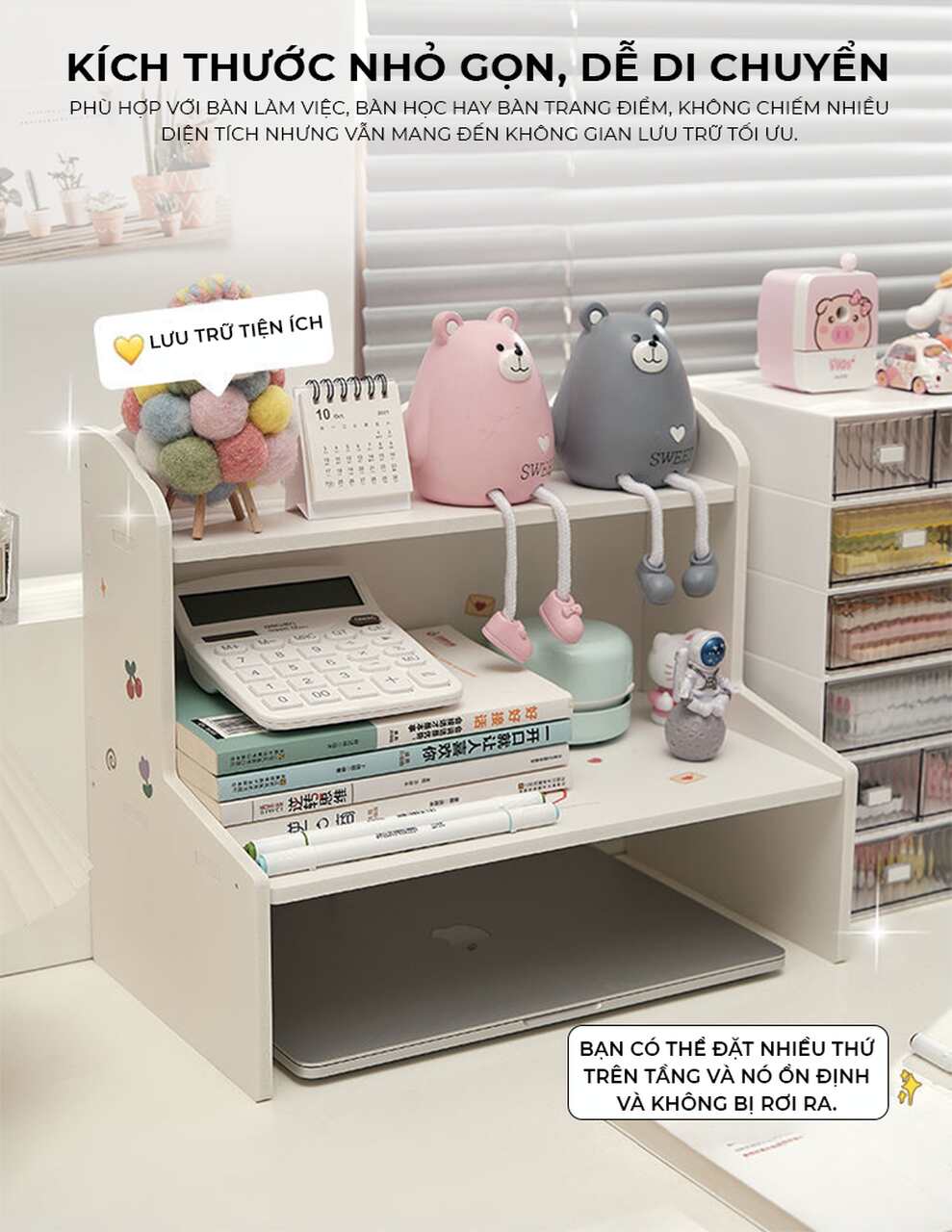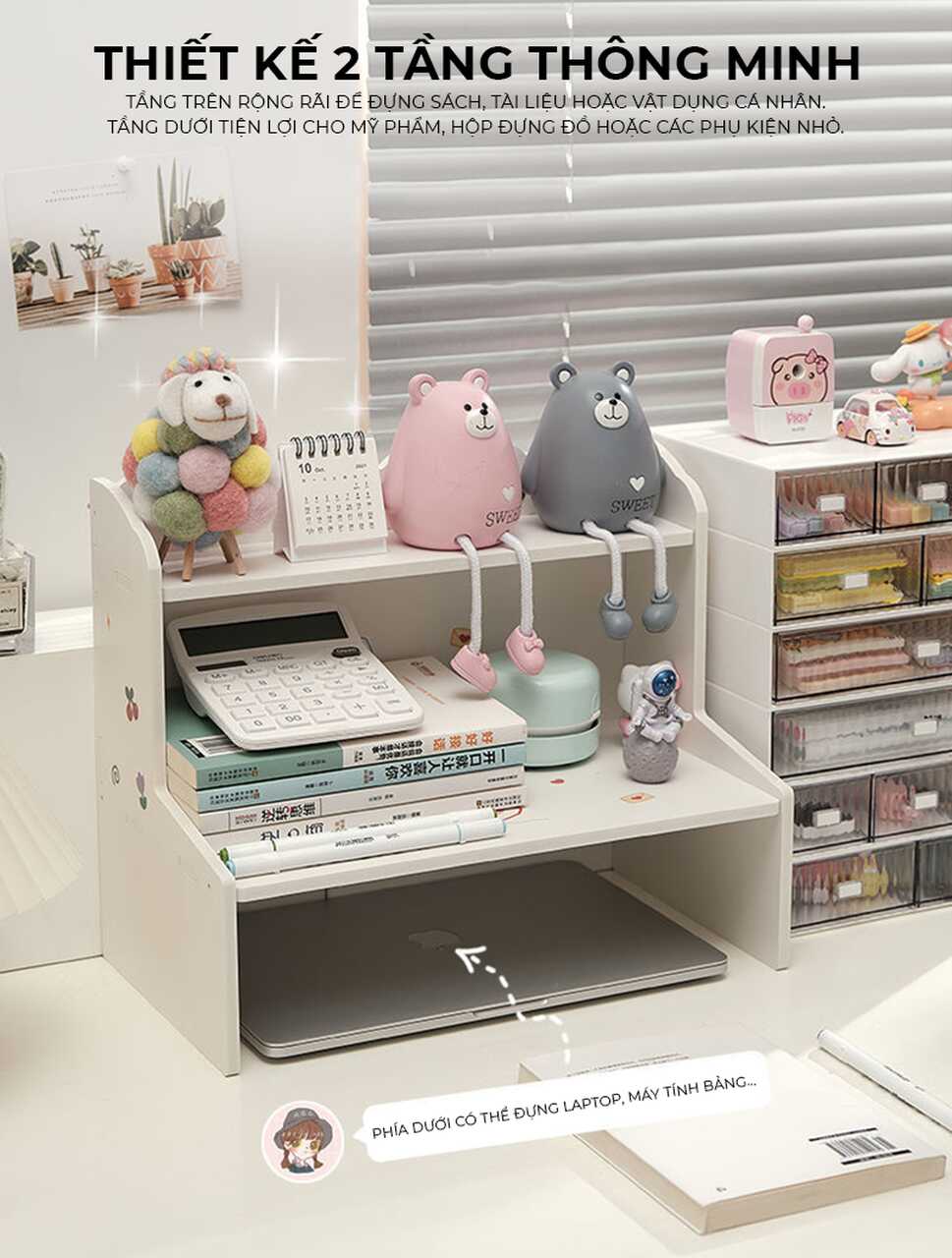 Tăng cường tính thẩm mỹ: Với thiết kế dễ thương và hiện đại, kệ không chỉ giúp bạn tổ chức đồ đạc mà còn làm đẹp thêm không gian làm việc của bạn.