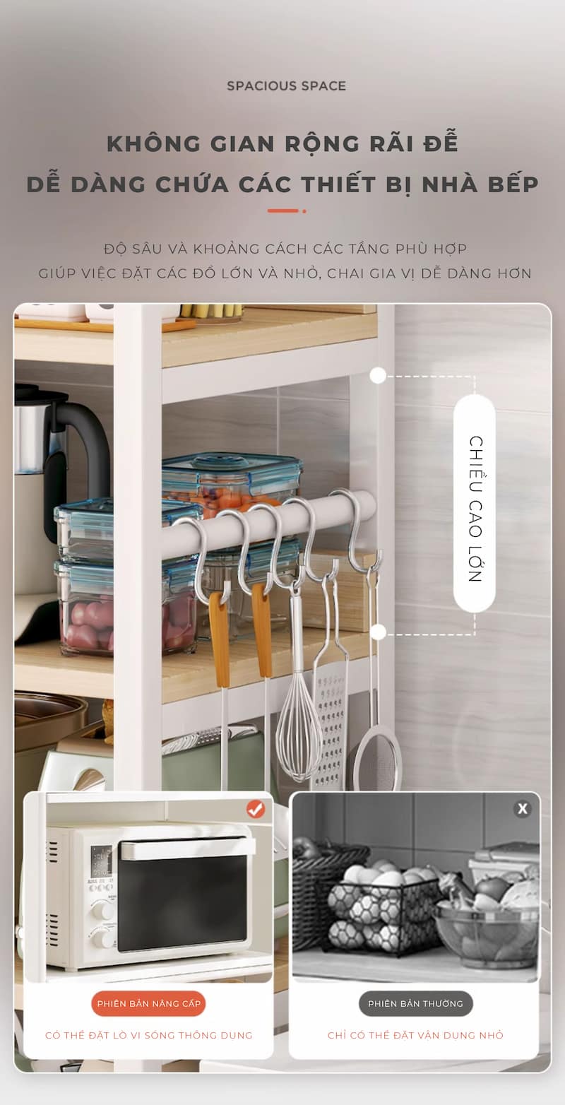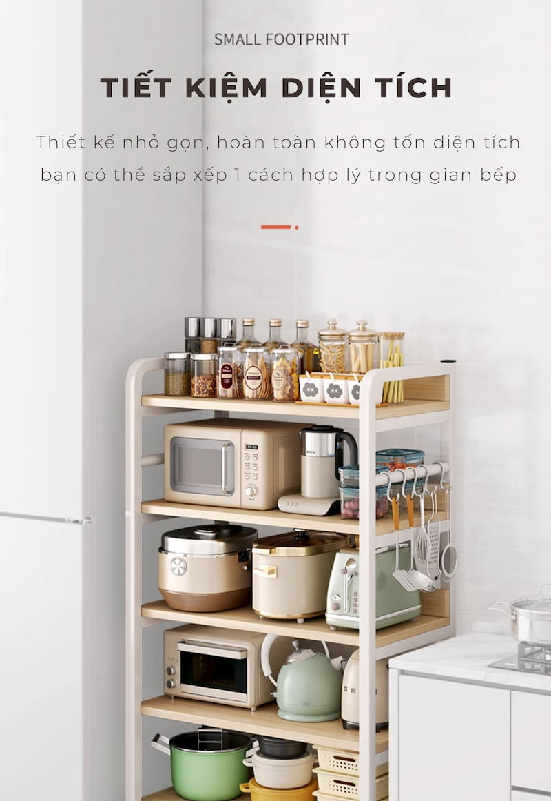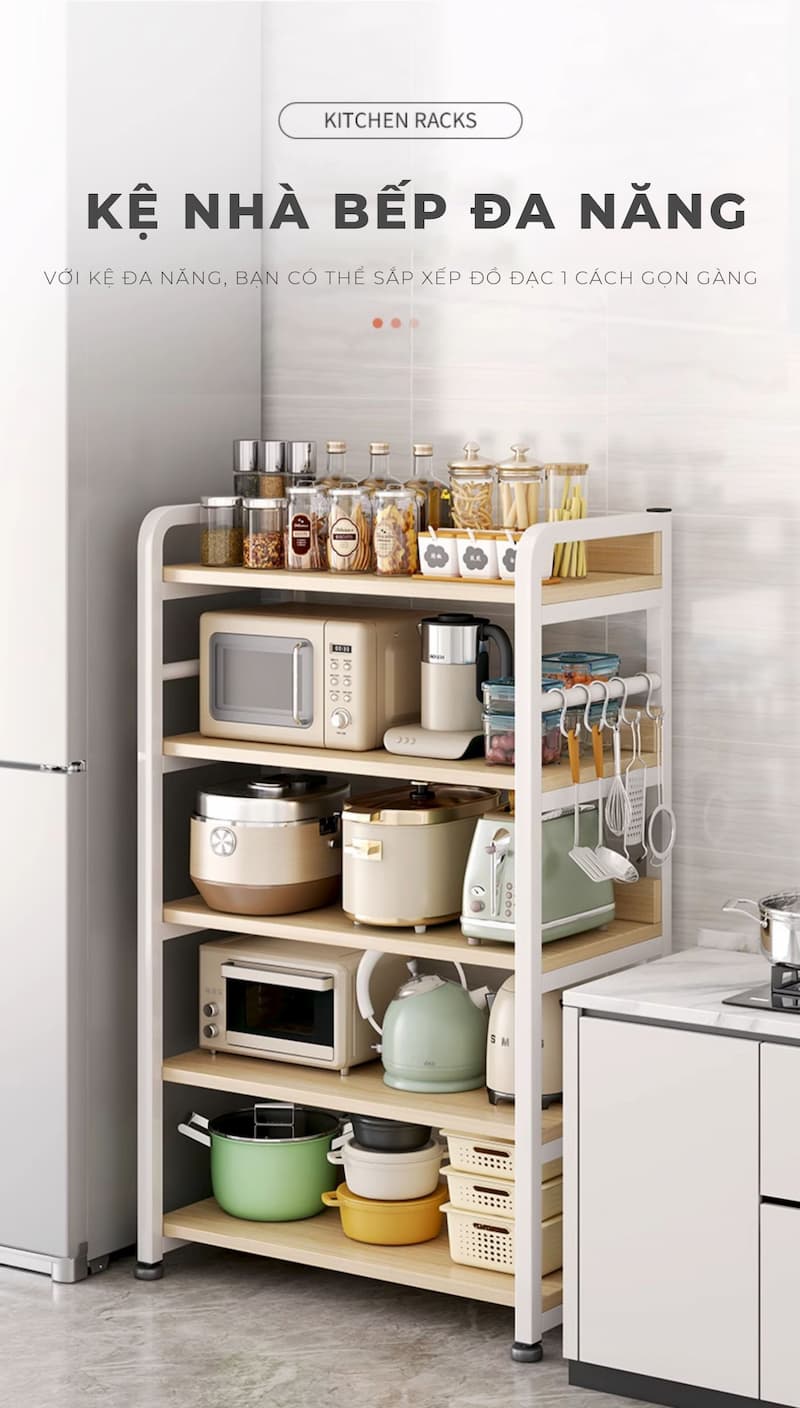Kệ để đồ nhà bếp đựng đồ 3 – 4 – 5 tầng là giải pháp tối ưu không gian lý tưởng cho mọi gia đình hiện đại. Từ những vật dụng nhỏ như gia vị, dao kéo đến nồi niêu, đồ khô – tất cả đều có “chỗ đứng” riêng với mẫu kệ tiện dụng này.