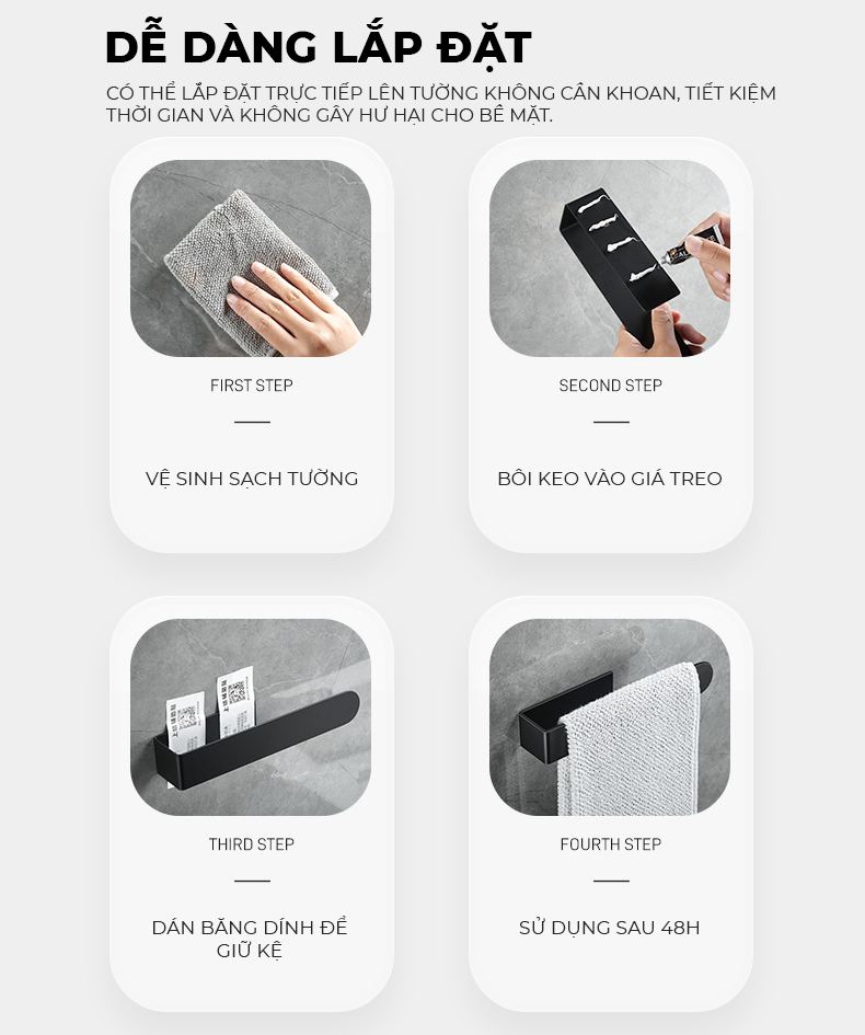 Lắp đặt đơn giản, chỉ cần dán hoặc khoan vào tường, tiện lợi và nhanh chóng