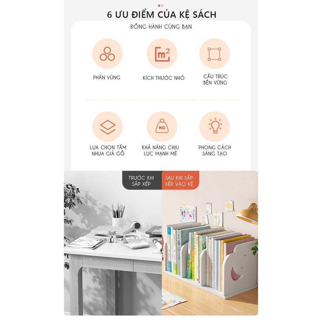 Kệ sách để bàn làm việc tiện lợi, tinh tế được thiết kế có những ngăn chứa đồ thuận tiện để giải quyết vấn đề bừa bộn ngổn ngang do đồ vật nằm lung tung trên bàn. Chiếc giá để đồ dễ lau chùi, vệ sinh không quá khó khăn khi sử dụng một thời gian.