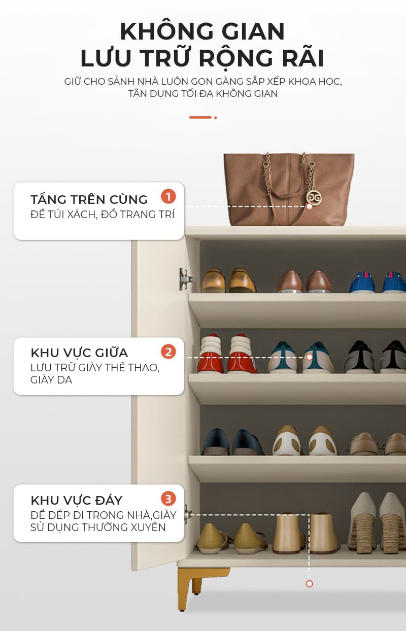 Công năng: Sử dụng để cất giày dép tại căn hộ, tại văn phòng, tại quán cafe, tại shop spa salon vô cùng thích hợp.