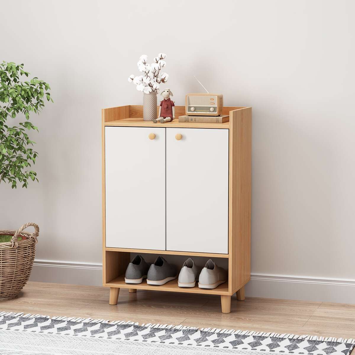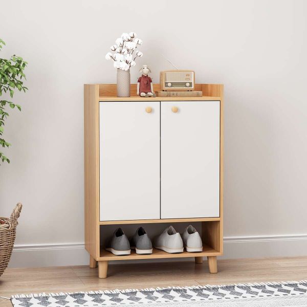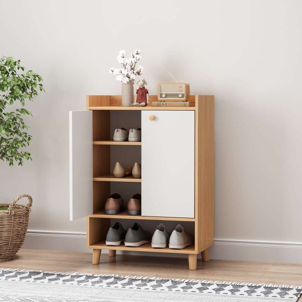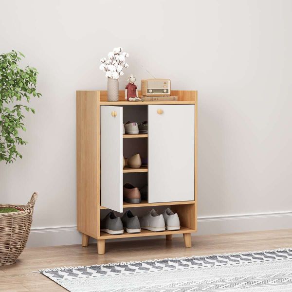 Tủ để giày dép với sự kết hợp độc đáo giữa màu vân gỗ truyền thống cùng màu trắng hiện đại mang đến không gian sống mới mẽ, trẻ trung.