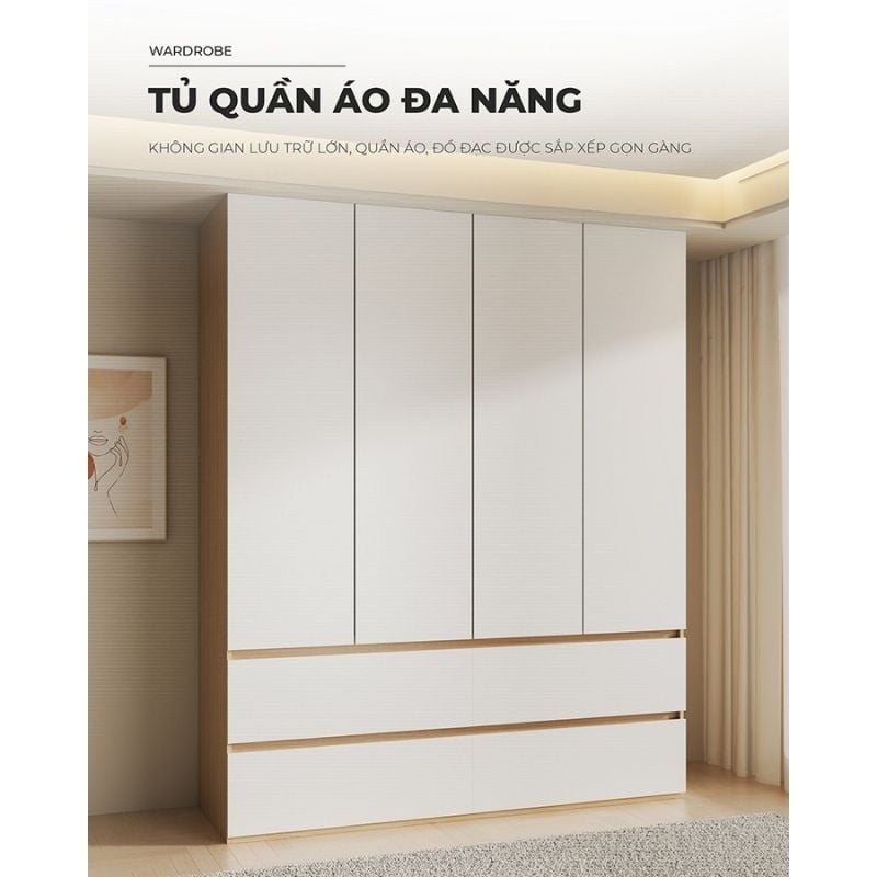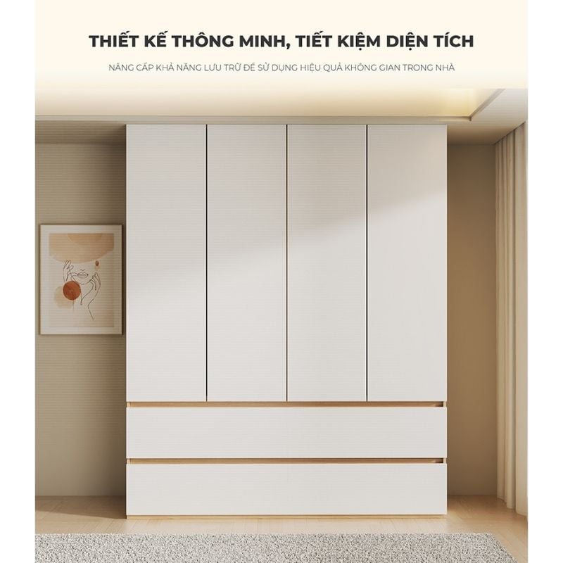 - Cửa tủ đóng mở thuận tiện, trữ đồ kín đáo không bám bụi trên quần áo